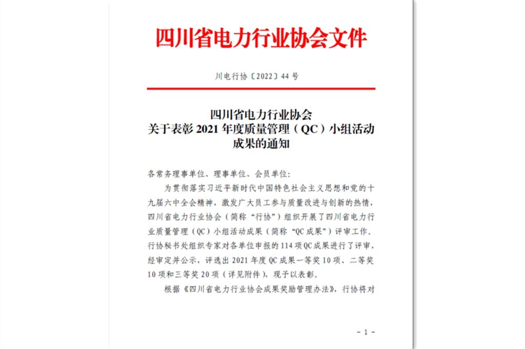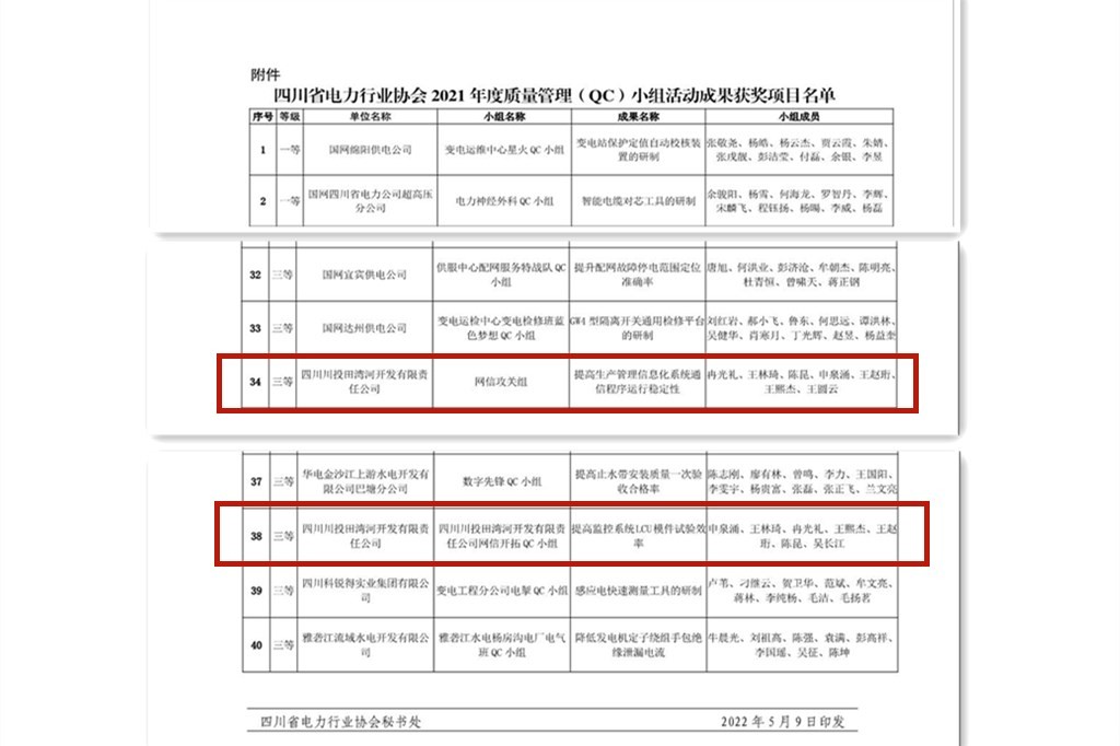 5月11日,四川省电力行业协会组织开展的省电力行业2021年度质量管理(QC)小组活动成果评审结果揭晓,必威必威公司《提高生产管理信息化系统通信程序运行稳定性》《提高监控系统LCU模件试验效率》两项QC活动成果荣获三等奖。